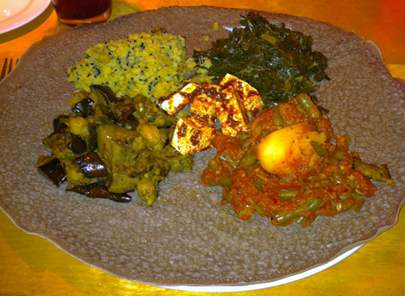 The platter arrived and commandeered a good portion of the table. My eyes widened and I inventoried my winnings—scoops of green beans in a tomato base, sweet lentil puree, garlicky eggplant with chickpeas, salty collard greens, and spicy tofu, all on a giant g-free pancake. With a napkin in my left hand I dug in with my right. Each stew complimented the other with a diverse range of flavors, spices and textures. Ethnic authenticity is beside the point for this American, farm-to-table rendition of an Ethiopian meal. It did not disappoint.