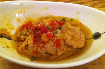 A large, hooked octopus arm covered in popped amaranth quickly took my attention away from our salad. It was almost too beautiful to cut through; I got over that quickly. The meat is the tenderest octopus I have had, accented by toasty grains that crackle in the mouth and a smokey, spicy eggplant purée. The chefs behind the counter and I begged Mr. Green Bean to try a bite, thinking this dish would surely convert him. Mr. GB argued that fried calamari is the closest he would ever come to grilled octopus, which the birthday chef took as a challenge. Moments later we were presented with a small plate of lightly fried octopus. Mr. GB tried it reluctantly and was polite enough to swallow.