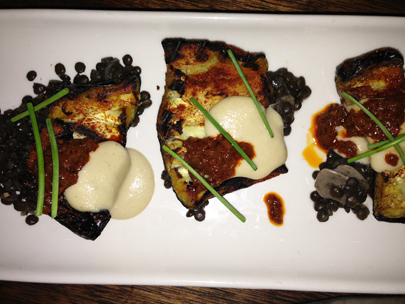 As our main course was served the Chef De Pue I know and love from Table finally performed. Mr. Oreo and Mr. Green Bean both ordered the Chapel Hill Farm Veal Meatballs with panisse (chickpea fritters, though not gluten-free here) and cucumber mostarda. The masculine dish was plated daintily and apparently tasted “really, really good”. Miss Oreo’s Crispy Cod with lemon parsley remoulade and fennel looked and tasted just as our server had described/warned: like a fish and chips egg roll. According to Miss Oreo, the rolls’ potato and fish filling could have used some classic tartar sauce to combat the dryness. Neither dish was fair game for my fork. Luckily I was perfectly happy with my Artic Char, served skin-side-up over artichoke hearts and diced vegetables in a light broth with dabs of what the menu calls “lemon puree”, but I call butter. The fish was delicate with a crispy skin and mild flavor that allowed the artichokes to shine.